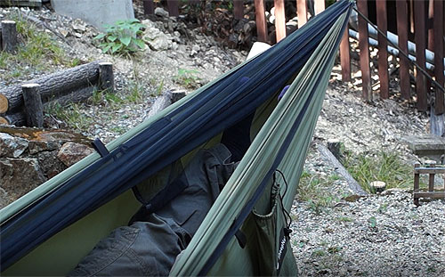 蚊帳を体にかけてハンモックに全身をゆだねます。