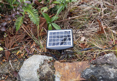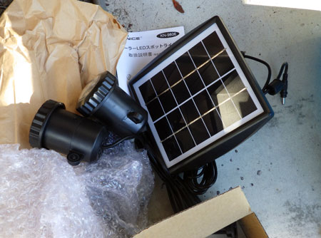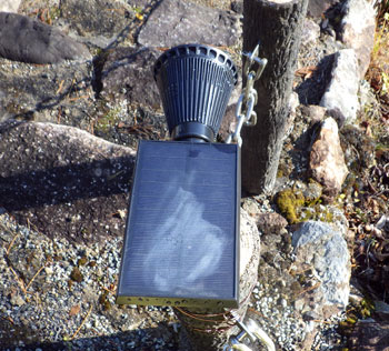 階段から玄関口に取り付けてある太陽光充電式LEDライト。