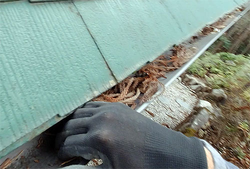 雨樋に乗った杉の枝を手で掻き出して落とします。