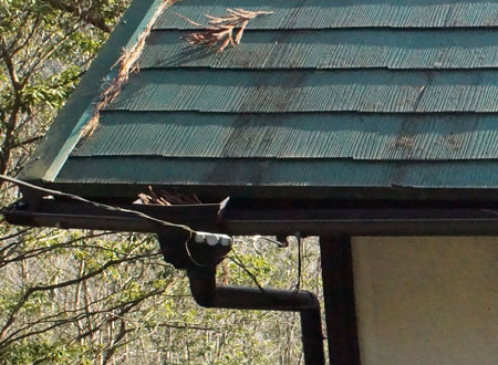 雨樋に杉の枯れ枝が幾つか乗っています。