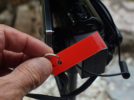 ヘラは落として失くさないようリングと紐を付けてカメラストラップ部に吊るしています。