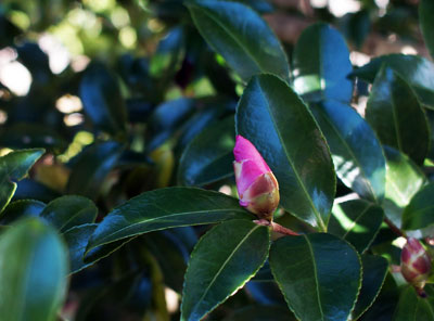 薄紅の花を咲かせるサザンカはまだ蕾。