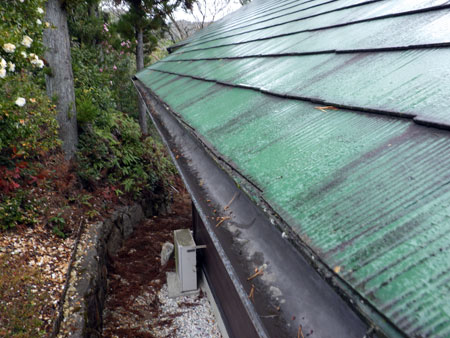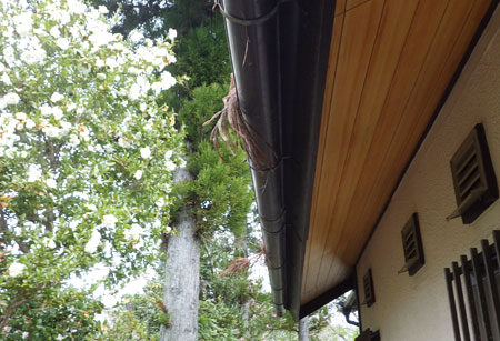 見上げると雨樋にも杉の枯れ枝がぶら下がっている。