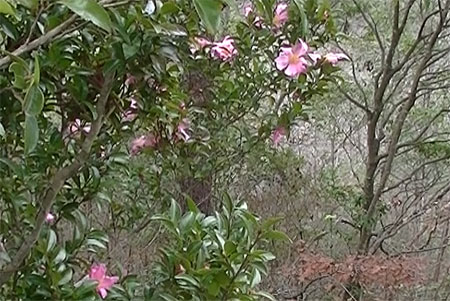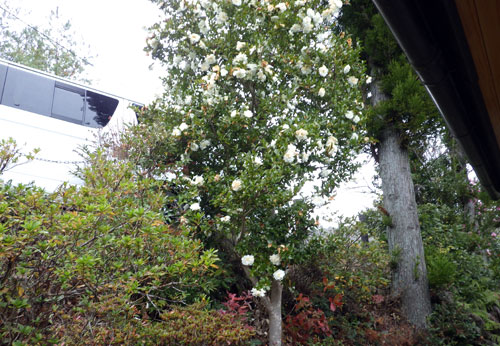 前庭に生えている白のサザンカは満開を通り越して一部枯れ始めています。