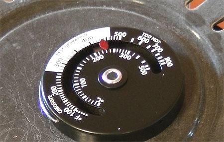 耐熱温度は350度までということなので最初にストーブの鉄板の上を温度計で測ります。