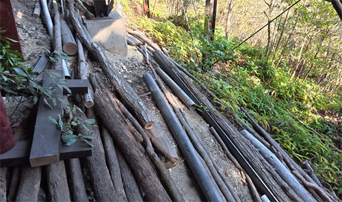 とりあえず、流れ出しを防ぐために丸太やら木の板を並べている。