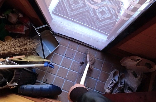 死骸を箒で掻き出して北側の部屋の雨戸に向かいます。